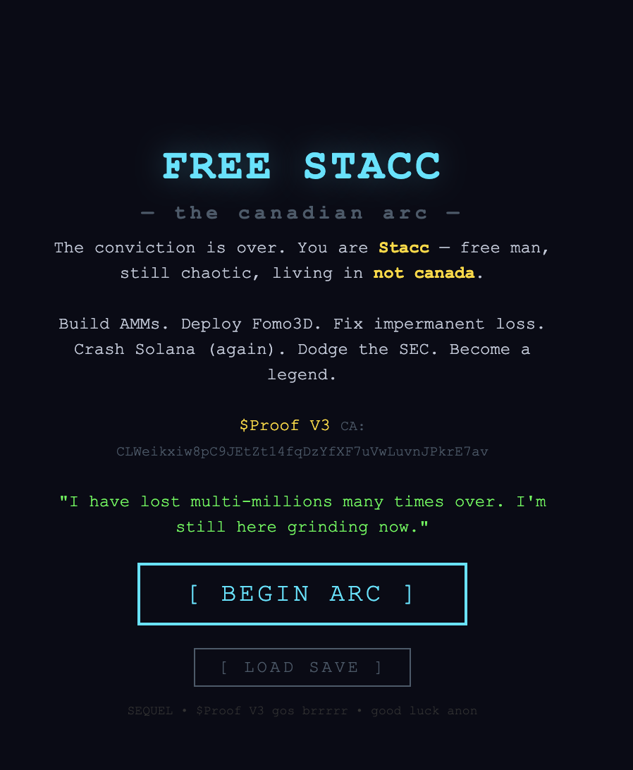 A retro pixel-art RPG set in the chaotic world of crypto culture. You play as Stacc — freshly free, living in "Not Canada," grinding through blockchain experiments. Deploy AMMs, crash Solana, fix impermanent loss, dodge the SEC, and talk your way through a cast of degens, mounties, and anons. Built as a single-file browser game with multiple rooms, NPC dialogue trees, stat tracking, and 3 endings. Keyboard + mobile d-pad controls.