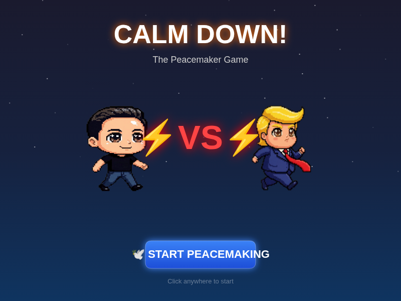 Stop Elon Musk and Donald Trump from arguing before chaos erupts! Pop insult bubbles, calm the characters, and survive 5 escalating levels from Mild Disagreement to World War III.