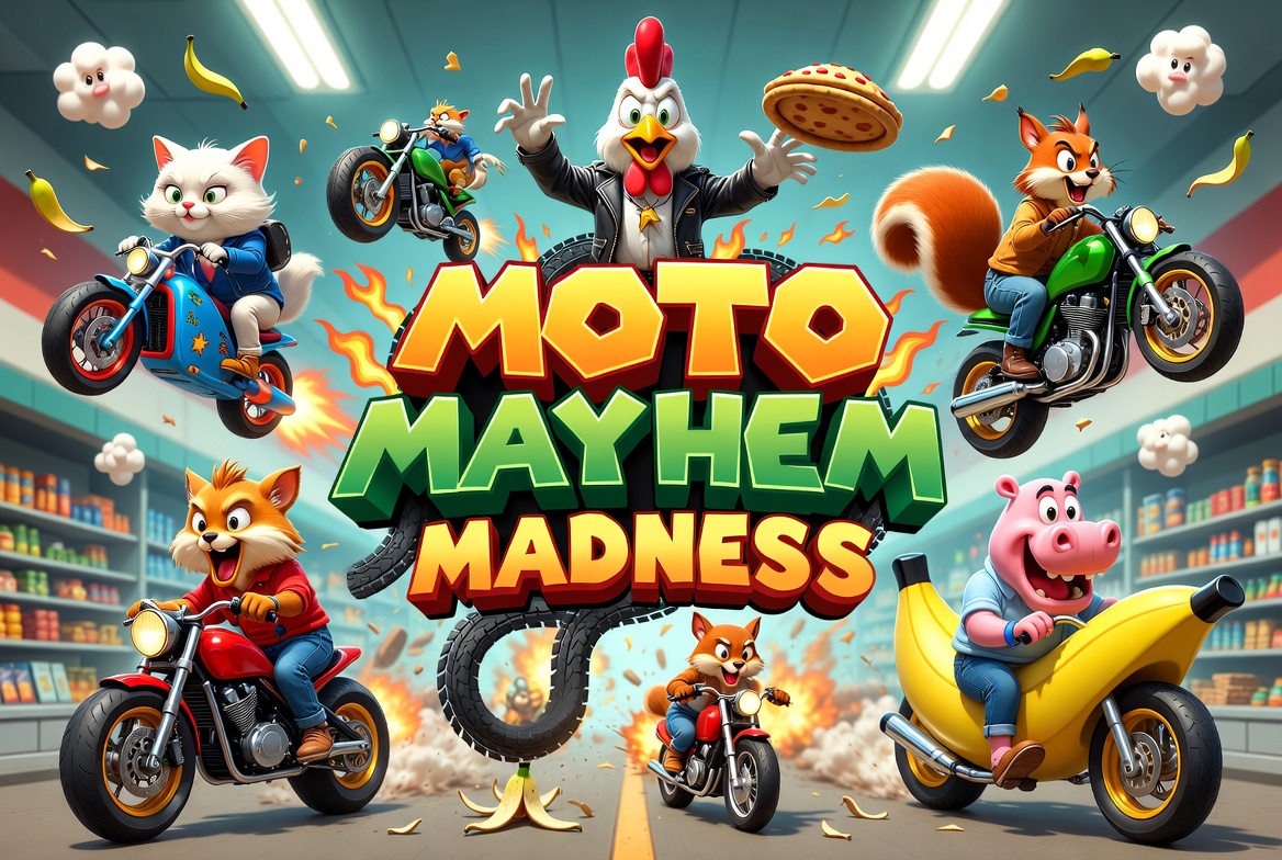 Ride crazy animals on silly bikes through kitchen & supermarket chaos.