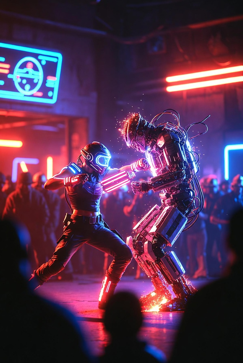 Battle through 10 escalating arcade levels in 2094's underground circuit. Choose from 6 unique fighters, face enemies with 5 different body designs and increasing AI difficulty — from Rookie to Final Boss. Combo attacks, special moves, block system & K.O. moments.