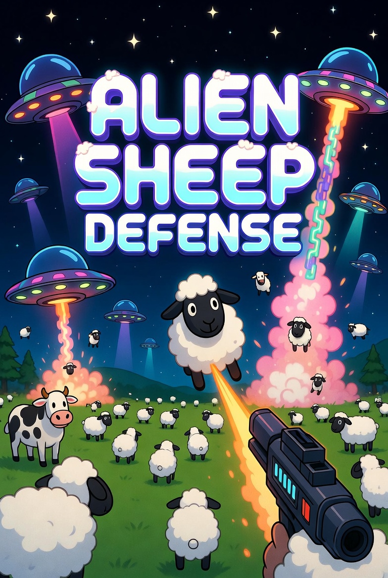 🛸 Alien Sheep Defense 🐑 The aliens are here, and they want our cows! In Alien Sheep Defense, you are the last line of defense for a peaceful pasture. A fleet of wobbly, neon UFOs is descending from the sky to abduct your precious herd using their glowing tractor beams. But you have a secret weapon: The Sheep Cannon. Take aim and launch fluffy, tumbling sheep into the sky! When a sheep hits its target, it explodes in a massive, bouncy cloud. The best part? If an alien UFO touches a sheep explosion, it triggers a massive chain reaction, wiping out the alien menace and racking up massive points! Features: Hilarious Physics: Watch sheep tumble through the air and UFOs wobble as they try to steal your cows. Satisfying Chain Reactions: Trigger one explosion and watch the whole sky light up as UFOs crash into each other. Custom "Farm-Fi" Audio: Features a custom-built Web Audio synthesizer that generates funny "Baa!" sounds, cartoon pops, and sad cow moos entirely in code. Endless Waves: The aliens get faster and spawn more frequently the longer you survive. How many waves can you beat before your pasture is empty? Controls: Mouse: Aim the Sheep Cannon crosshair. Left Click: Fire an explosive sheep! (Watch the cooldown!)