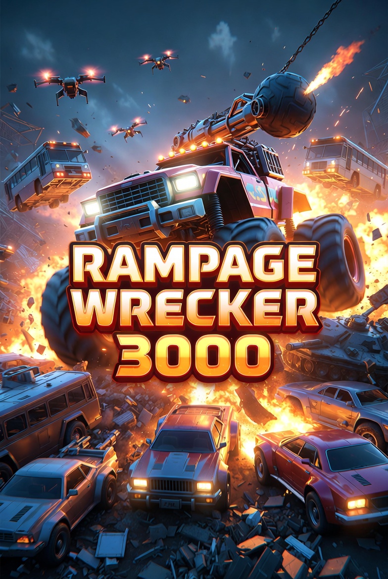 nleash total chaos in the ultimate junkyard demolition derby! You pilot the Rampage Wrecker 3000 — a massive, upgradeable monster truck armed with a giant wrecking ball, nitro boosters, and magnet claws. Smash wave after wave of enemy cars, buses, tanks, and flying drones in an endless arena of scrap metal and explosions. Ram, spin, crush, and send vehicles flying while collecting glowing scrap parts to upgrade your beast: bigger wrecking ball, flame throwers, EMP pulses, turbo spikes, and more.