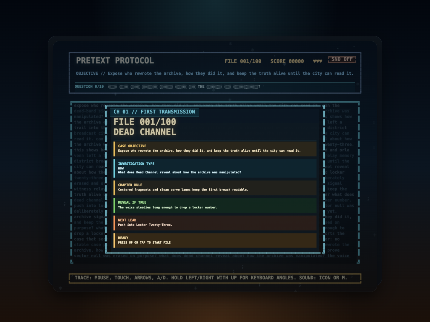 A story-driven text arcade breaker where you crack evidence fragments, recover case files, and push for a clean final score.