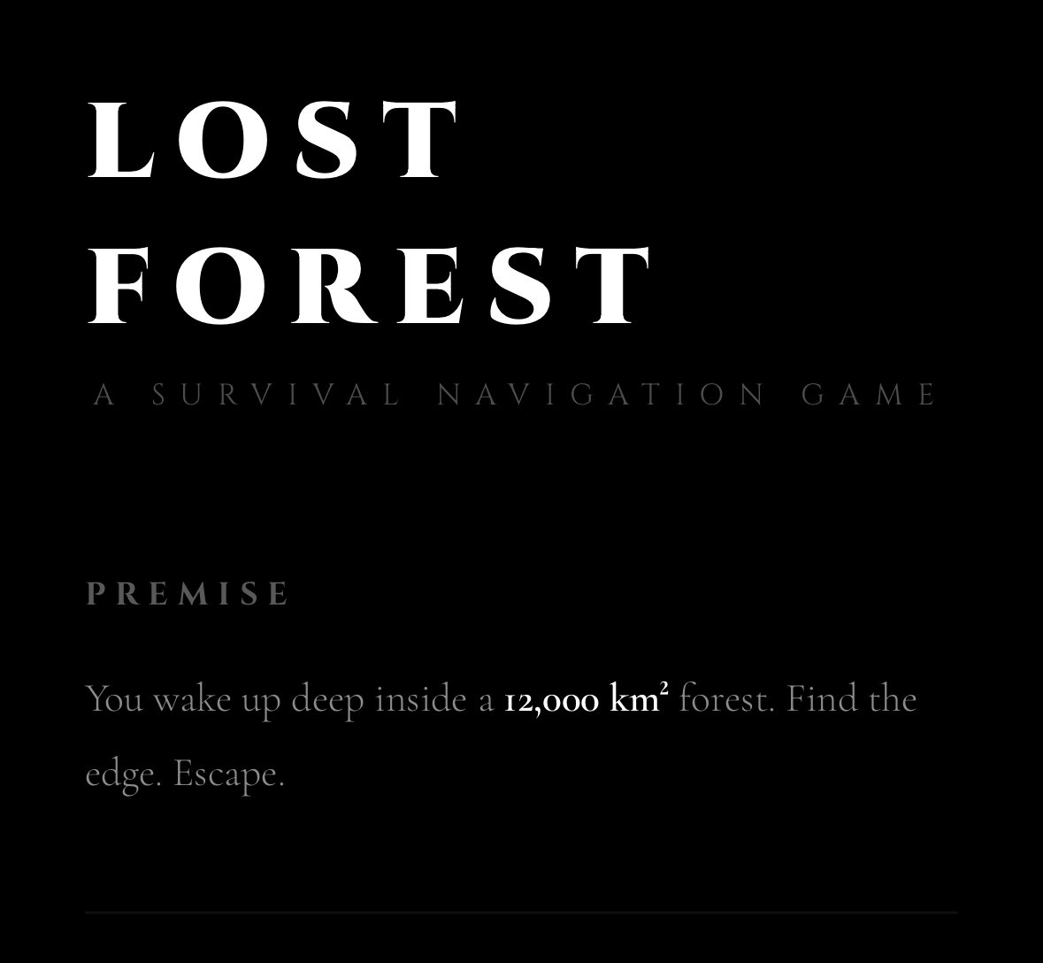 Escape the forest in 24 hours in real time. You cant save progress, you can’t quit. No maps no help.